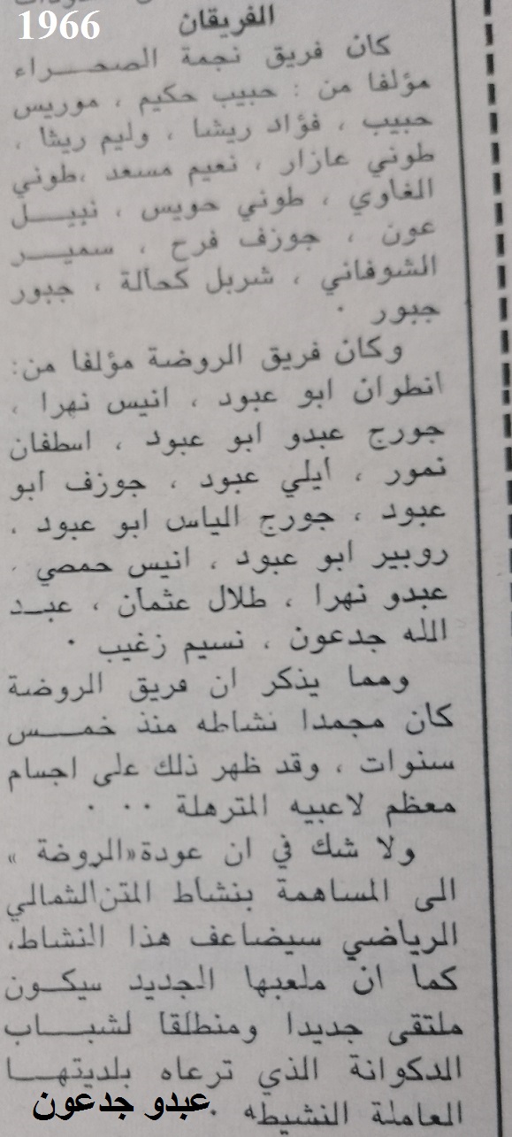 نادي الروضة الرياضي - الدكوانة : تأسس سنة 1941 المؤسسون : جوزف توفيق عنيد - يوسف حنا بو عبود - جورج قيصر ابي حبيب - اميل قيصر ابي حبيب - ادمون يوسف وازن - توفيق قيصر ابي حبيب - جان نعيم الخوري - يوسف رزق الله زعيتر. رؤساء النادي المتعاقبون : جوزف توفيق عنيد - ملحم جرجس الصيفي - جوزف حنا ضاهر الناكوزي - انطوان ابراهيم ملحم بو عبود - روبير عبود ابي عبود - جورج عبدو خير ابو عبود - انطوان جورج قيصر ابي حبيب - عبدو مارون ابو عبود - عبدو سامي خوري - جورج توفيق زيدان - خليل بطرس بو عبود - جورج انطون بطرس بو عبود. |
