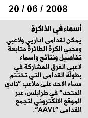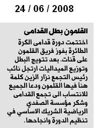 نتائج بطولة القدامى 16/6/2008 قدامى القلمون - قدامى القلب الاقدس 3/0 17/6/2008 قدامى قنات - قدامى شحيم 3/1 مركز الصفدي - قدامى الزلقا 3/1 19/6/2008 مركز الصفدي - قنات 0/3 القلمون - المينا طرابلس 3/0 21/6/2008 نهائي الدورة الساعة 7 مساء قدامى القلمون - قدامى قنات 3/1 وفاز بالبطولة