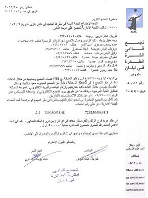 صادر رقم 10/2011 غزير في 08 / 03 / 2011 حضرة العضو الكريم نتيجة لاجتماع الهيئة العامة في مقرها الجديد في نادي غزير بتاريخ 6 / 03 / 2011 ، شكلت اللجنة الادارية للتجمع على الوجه التالي : كبريال عادل دريق رئيسا هاتف 305405/03 نزيه خليل يزبك نائبا للرئيس وممثل التجمع لدى الدوائر الرسمية هاتف 898654/03 عبده يوسف جدعون امينا للسر هاتف 607776/03 جوزيف الياس عويضة امينا للصندوق هاتف 838201/03 توفيق الياس مرعب محاسبا هاتف 558686/03 انطوان سليم ابو جودة عضوا هاتف 957896/03 فوزي بربر كرم عضوا هاتف 763150/03 كمال باقر الزنجي ( يعقوب ) عضوا هاتف 957299/03 نبيل نجم زينون عضوا هاتف 707779/03 ان اللجنة الادارية ، اذ تتطلع الى توطيد العلاقة مع كافة اعضاء التجمع وتمتينها من خلال لقاءات تعقد في مقر التجمع او في المناطق المختلفة ، تأمل من الجميع التجاوب معها وتثبيت وسائل الاتصال بهم من خلال اعادة تأكيد عناوينهم وارقام الهاتف والبريد الالكتروني بالسرعة الممكنة لتحقيق الغاية المرجوة ، وذلك اما عن طريق بريد التجمع الالكتروني او بواسطة التيليفاكس على الرقم 920044/09 ، او من خلال الاتصال بأحد الاداريين . كما نأمل من الجميع المبادرة الى تسديد اشتراكاتهم مباشرة في مقر التجمع او بواسطة أحد أعضاء الهيئة الادارية ، او على رقم الحساب : 729350/06.48 $ 729350/05.48 ل ل في بنك عودة فرع الزلقا والذي يمكن سداده في اي فرع من فروع البنك المذكور ، علما ان الحد الادنى للاشتراك السنوي خمسون الف ليرة لبنانية /50.000/ ل ل . شاكرين لكم سلفا حسن تجاوبكم ، راجين ان نتمكن واياكم من الوصول الى الافضل . وتفضلوا بقبول الاحترام الرئيس امين السر كبريال عادل دريق عبده يوسف جدعون |