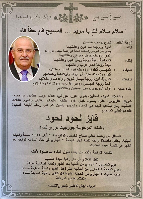 01-05-2025 رئيس وأعضاء تجمع قدامى الكرة الطائرة في لبنان ينعي أحد أعضائه الفاعلين الاستاذ فايز لحود لحود، الرجل النبيل والعامل في تعزيز التواصل والخدمة العامة بين ابناء القطاع الرياضي في لبنان. رحلت بالجسد ايها الاستاذ، لكنك ستبقى خالداً في قلوبنا، وقلوب من احبوا الرياضة، كما سنفتقد حكمتك وتضحياتك كنموذجاً يُحتذى به، رحم الله الفقيد الغالي وتعازينا الى عائلته الكريمة والى اهل عائلات بلدته عمشيت وعائلة الكرة الطائرة. لتكن، نفسه بالسماء واسكنه الله جناته امين السرعبدو يوسف جدعون الرئيس نزيه خليل يزبك |