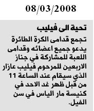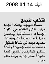 الزلقا في 11 / كانون الثاني / 2008دعوة لانتخاب لجنة جديدة لتجمع قدامى الكرة الطائرة في لبنان . عملا باحكام القانون ، يدعو التجمع جميع اعضائه المنتسبين الى جلسة تعقد في مقره في الساعة الحادية عشرة من قبل ظهر الاحد 24/شباط/2008 لانتخاب لجنة جديدة . وفي حال عدم اكتمال النصاب ، تؤجل الجلسة الى يوم الاحد 2/آذار/2008 في نفس المكان والساعة . نذكر الاعضاء بضرورة تسديد الاشتراكات قبل الانتخابات ، وبالمادة السابعة التي يحتم اقفال باب الترشيح قبل اسبوع من موعد الانتخاب اي مساء 17 / شباط / 2008 امين السر عبده جدعون |