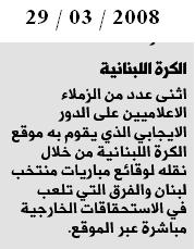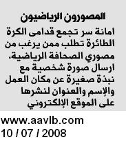 الزلقا في 22 / 10 / 2008 حضرة امين سر المحترم تحية واحتراما . من مبدأ تعزيز أخبار الكرة الطائرة وتوثيق ما يمكن ، من تاريخها المجيد في لبنان ، وتاريخ الرياضة فيه يسرنا ابلاغكم ان موقعنا الالكتروني www.aavlb,com يستقبل اي مستندات أو صور عن ناديكم وادارييكم ولاعبيكم يمكن ارسال هذه المستندات على بريدنا الالكتروني أو الى مكاتب التجمع في الزلقا الاوتوستراد فوق SEA SWEE والدويهي ، بناية لو بارون الطابق 11 بلوك ب