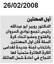 17/02/2008 من بين الذين قدموا تراشيحهم لانتخابات تجمع قدامى الكرة الطائرة يوم الاحد المقبل ،غبريال دريق عضو اللجنة التاسيسية ونزيه يزبك الرئيس الاسبق لنادي الانوار الجديدة ، وقد لقي ترشيحهما ترحيبا من كل الاعضاء البلد |