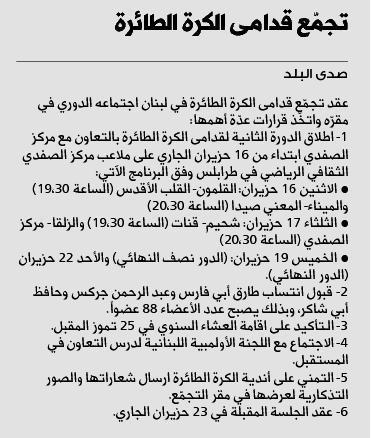 صادر رقم 57/8 مقرّرات تجمّع قدامى الكرة الطائرة الى الزملاء الكرام عقد تجمّع قدامى الكرة الطائرة في لبنان اجتماعه الدوري في مقرّه واتخّذ عدّة مقرّرات أهمها: 1- اطلاق الدورة الثانية لقدامى الكرة الطائرة بالتعاون مع مركز الصفدي ابتداء من 16 حزيران الجاري على ملاعب مجّمع الصفدي الرياضي(طرابلس) وفق البرنامج التالي: - الاثنين 16 حزيران: القلمون- القلب الأقدس الساعة 19،30، الميناء- المعني صيدا الساعة 20،30. - الثلاثاء 17 حزيران: شحيم- قنات الساعة 19،30،الزلقا- مركز الصفدي الساعة 20،30. - الخميس 19 حزيران(الدور نصف النهائي)-الأحد 22 حزيران(الدور النهائي). 2- قبول انتساب طارق أبي فارس،عبد الرحمن جركس وحافظ أبي شاكر.وبذلك يصبح عدد الأعضاء 88. 3- الـتأكيد على اقامة العشاء السنوي في 25 تموز المقبل. 4- الاجتماع مع اللجنة الأولمبية اللبنانية لدرس امكانية التعاون في المستقبل. 5- التمني على أندية الكرة الطائرة أرسال شعاراتها والصور التذكارية لعرضها في مقر التجمّع. 6- عقد الجلسة المقبلة في 23 حزيران الجاري. الأمين العام عبده جدعون |