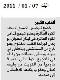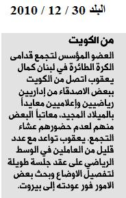 تجمع قدامى الكرة الطائرة 22/ 09 / 2011 قدّم رئيس اللجنة الادارية لتجمع قدامى الكرة الطائرة في لبنان غبريال عادل دريق استقالته من اللجنة في 19 آب الماضي، وقبلتها اللجنة الادارية في جلستها المنعقدة في 19 أيلول 2011 في مقرها بالنادي الرياضي غزير ، وكلفت اللجنة نائب الرئيس القيام بالمهام تطبيقا للمادة 12 من النظام الداخلي للتجمع . |