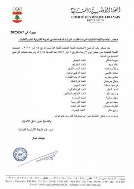عام اللجنة الأولمبية اللبنانية جودت شاكر، والتي "يطلب في خاتمتها