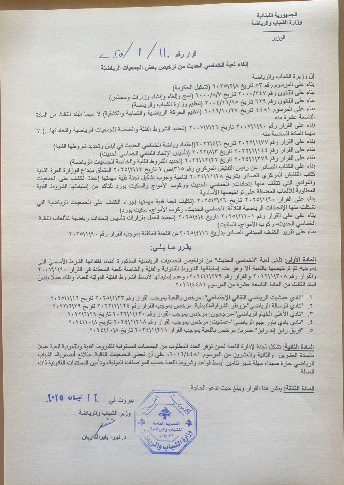 مصلحة الرياضة اللبنانية والرياضيين.