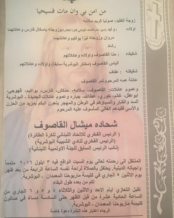 قدامى عمشيت 26-10-2016 * ملعب المون لا سال الساعة 19:00 و 20:30 : * ملعب المون لا سال الساعة 19:00 و 20:30 : الجمعة 28-10-2016 يلعب فريق قدامى دراغستور 3 يو مع فريق قدامى العاصفة جل الديب (على المركزين الثالث والرابع) * مجمع المر الرياضي الساعة 19:30 يلعب فريق قدامى البوشرية مع فريق قدامى عمشيت (على المركزين الاول والثاني) ويصار الى توزيع الكؤوس نأمل حضوركم |